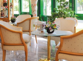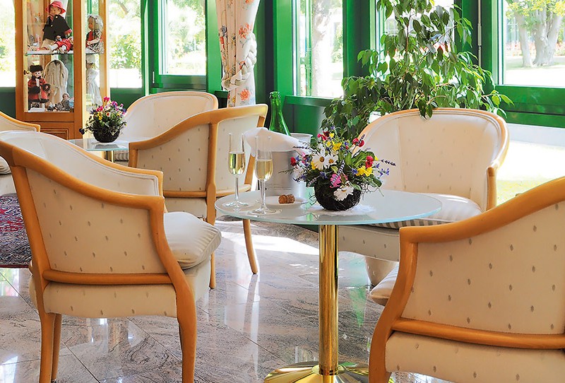 В дневное время гости могут насладиться чашечкой кофе с домашней выпечкой, в теплую погоду весной, летом или осенью обслуживание производится на террасе в великолепном саду отеля Ott.