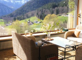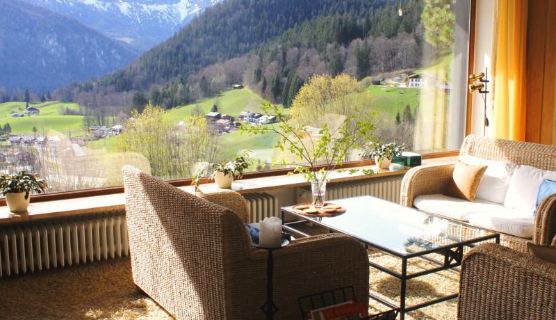 В гостиной с камином и большими панорамными окнами с видом на Берхтесгаден приятно расслабиться с любимым напитком.