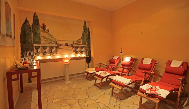 Спа-зона с финской сауной, парной, комнатой отдыха и подогреваемыми шезлонгами.